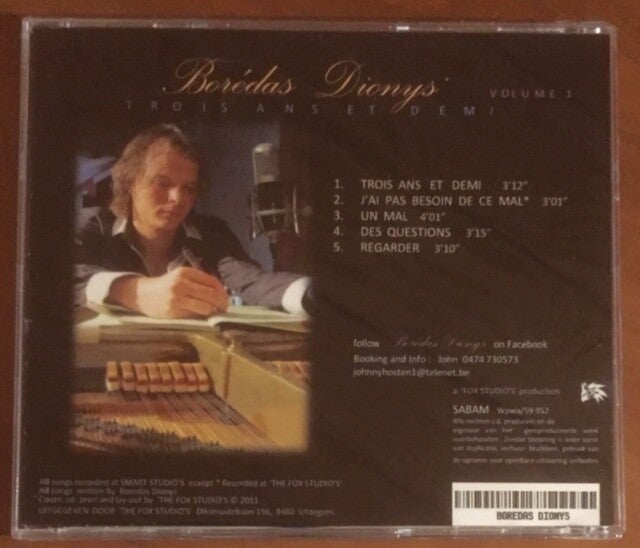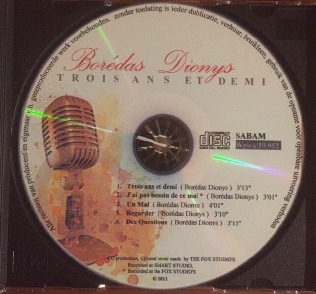 Franse muziek, teksten zijn geschreven door Borédas Dionys zelf ( songwriter). Je kan ook alle nummers van Borédas Dionys terug vinden op youtube. In 2014 heeft Borédas Dionys de prijs gewonnen voor creatieviteit, dit als enigste Belg, tijdens het 30ste Concours de la Chanson in Den Haag ( kan je ook terug vinden op youtube).